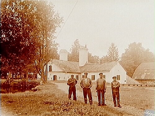 Österby Bruk, gamla valonsmedjan med fyra smeder framför smedjan.