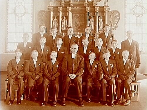 Konfirmander, 18 pojkar och pastor Jönsson.