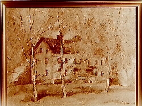Oljemålning. Motiv: Hus, av konstnären Ture Ander, 1919.