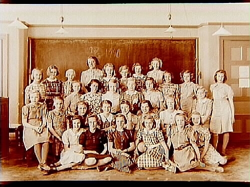 Engelbrektsskolan, klassrumsinteriör, 29 flickor med lärarinna fru Vinström, klass 6, sal 23.