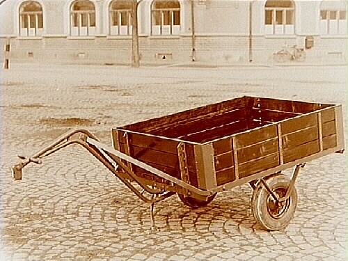 Tvåhjulig släpvagn med gummihjul.