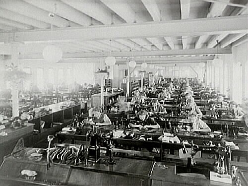 Fabriksinteriör, interiör från nåtlingen och skärningen.