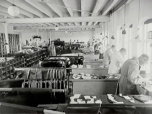 Fabriksinteriör, interiör från nåtlingen och skärningen.