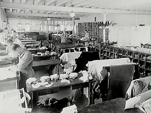 Fabriksinteriör, interiör från nåtlingen och skärningen.