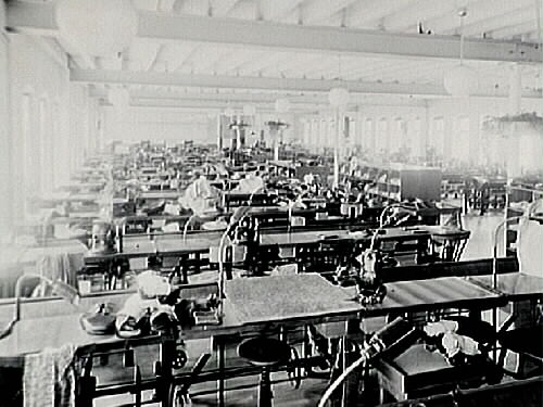 Fabriksinteriör, interiör från nåtlingen och skärningen.