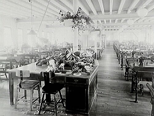 Fabriksinteriör, interiör från nåtlingen och skärningen.