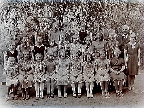 Rynninge skola, 27 skolbarn med lärare Sam. Nystedt på skolgården.