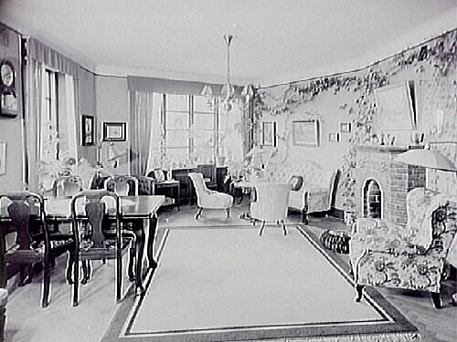 Titel: Rumsinteriör med stolar, soffa och bord.