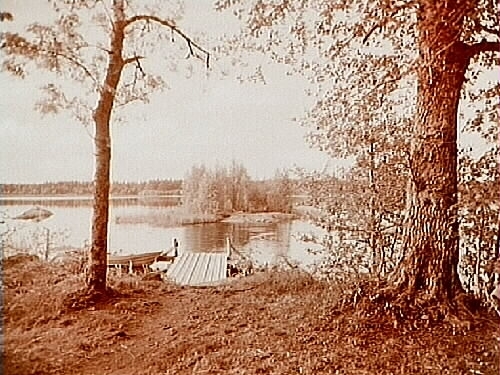 Skogaholmssjön, brygga med en båt, sjöutsikt.