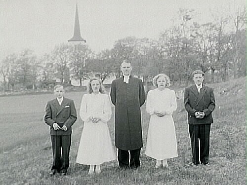Konfirmander, 2 flickor, 2 pojkar och pastor Sven Ljunggren.