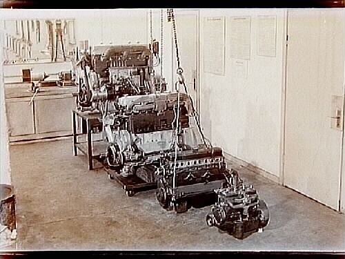 AB Motorrenovering, interiör, fyra bilmotorer.