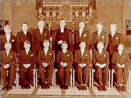 Konfirmander, 13 pojkar och pastor Rickard Åsberg.