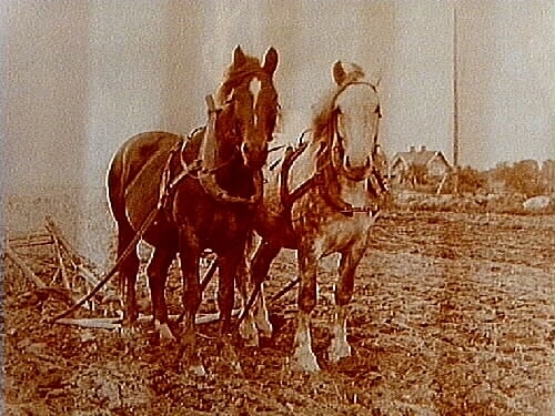 Två hästar, Stina och Grålle, spända för plog.