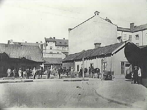 Järntorgsgatan 7-9 med häst och vagnar i förgrunden, före byggandet av G.O.V.Lindgrens hus.