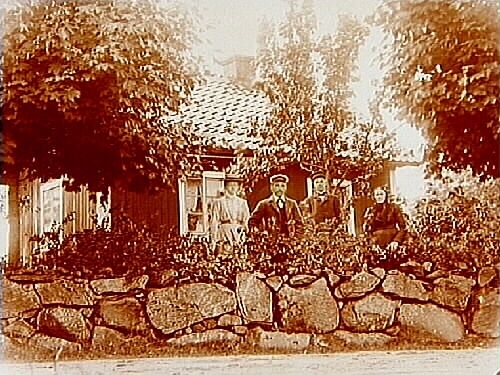 Bostadshus, grupp 4 personer framför huset.