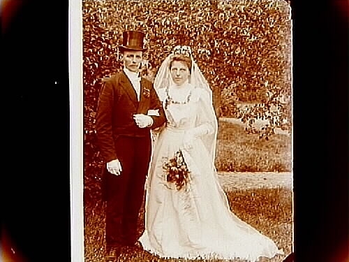 Brudpar, bruden helt i vitt, brudgummen i frack och hög hatt.