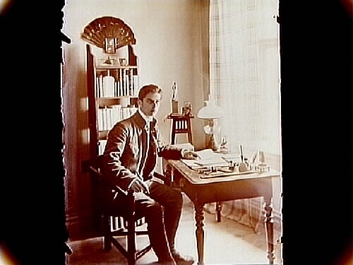 Rumsinteriör, ung man vid skrivbordet.