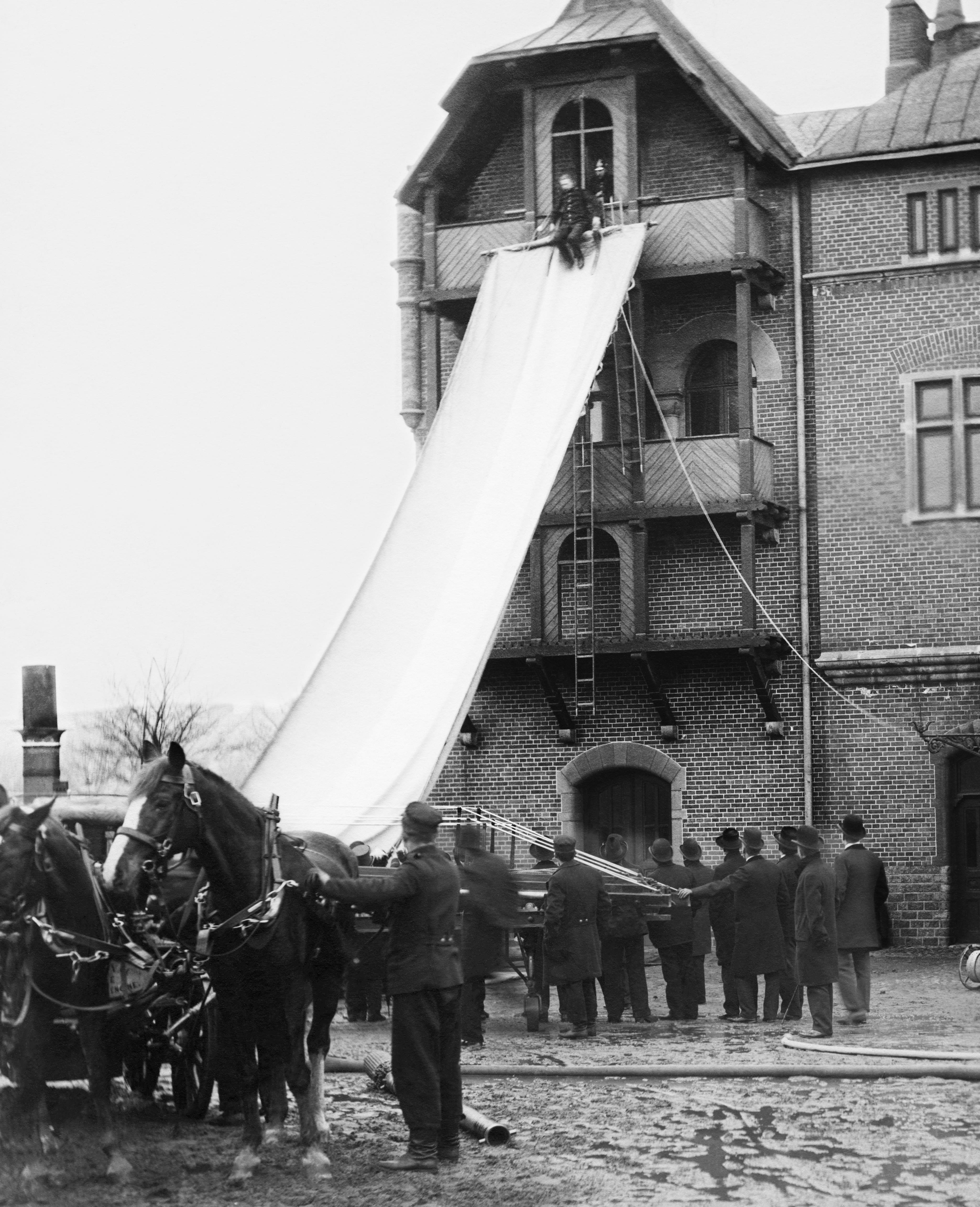 Brandstationen på Drottninggatan 20, med brandsegel, brandmän och hästar. Foto ur tidskriften "Hemmet", 1906 - 1908.