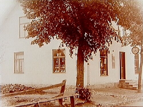 Urmakeri, en och en halvplans bostadshus med urtavla.