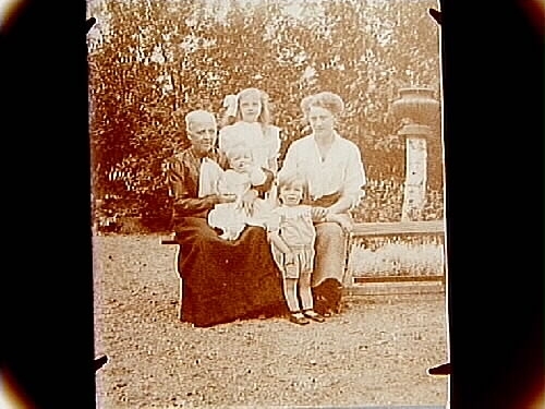 Grupp, 2 kvinnor och 3 barn i trädgården.
