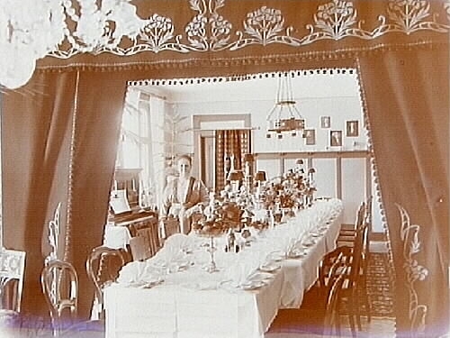Rumsinteriör, matsalen med dukat långt bord, en kvinna.