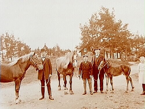 Två män, en pojke, en flicka, två hästar och ett föl.