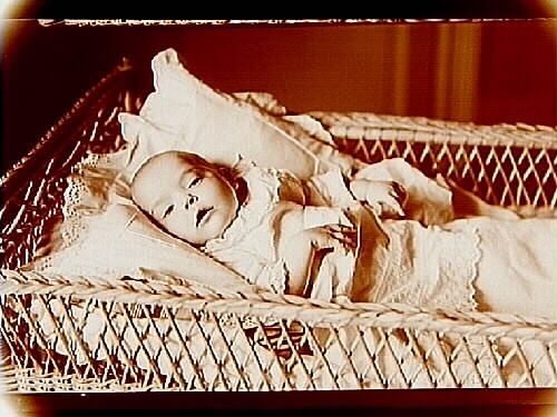 Sjukt barn i korgsäng.