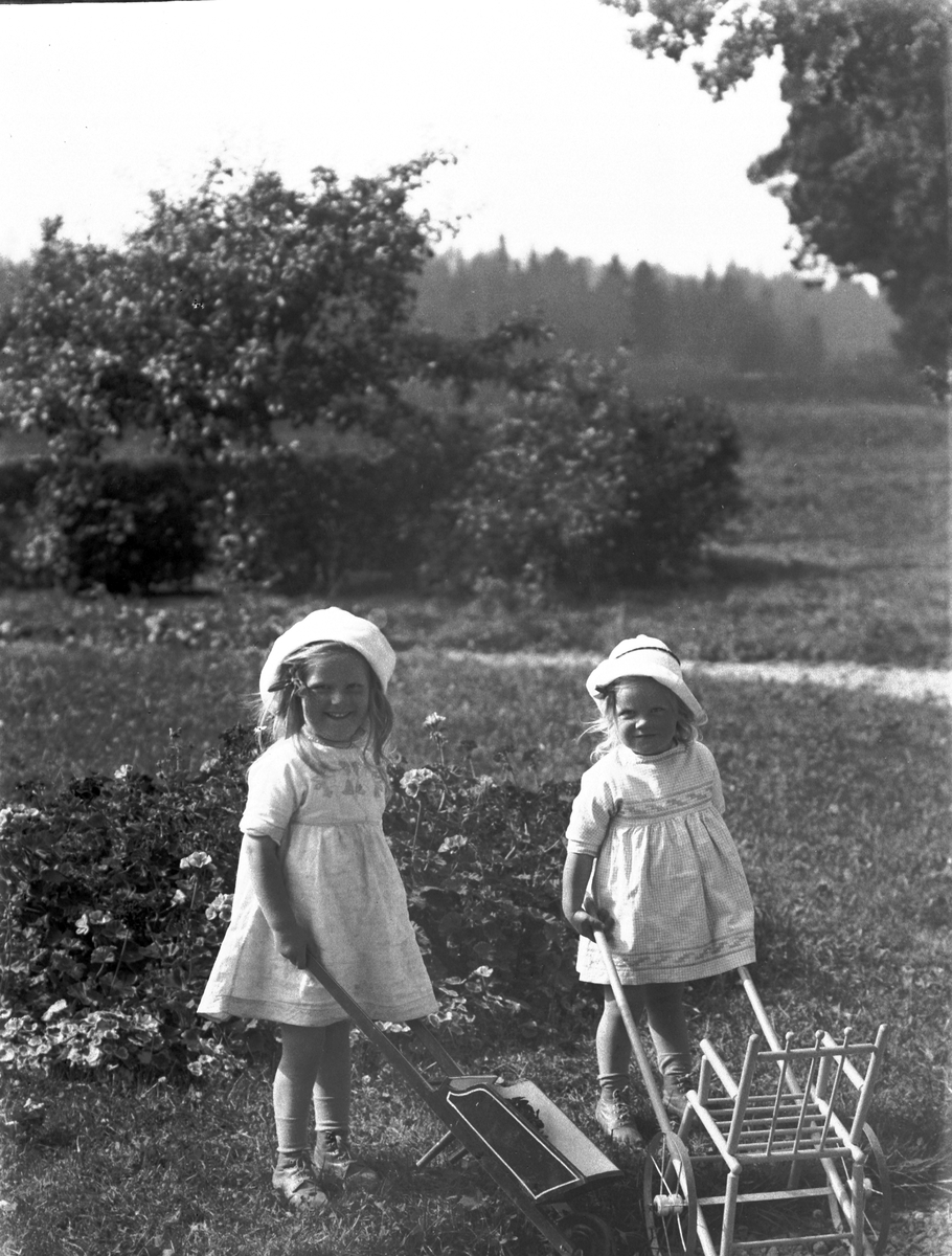 Två småflickor med leksakskärra och skottkärra.