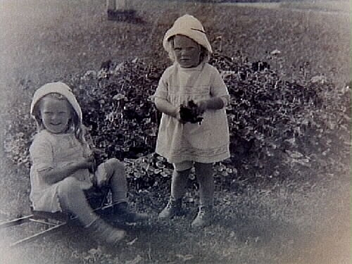 Två småflickor med leksakskärra och skottkärra.