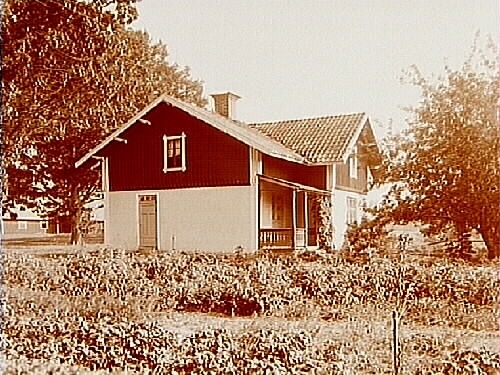 En och en halvvånings vinkelbyggt bostadshus med veranda.