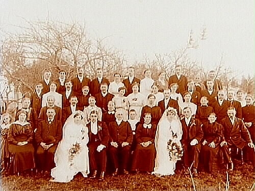 Dubbelbröllop. Två st. brudpar och bröllopsgäster.