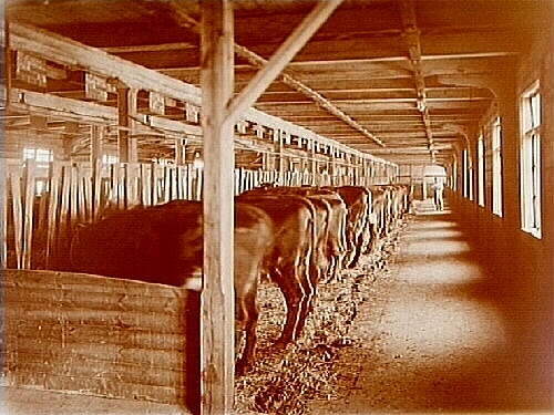 Ladugårdsinteriör, liggande och stående kor vid foderbordet.