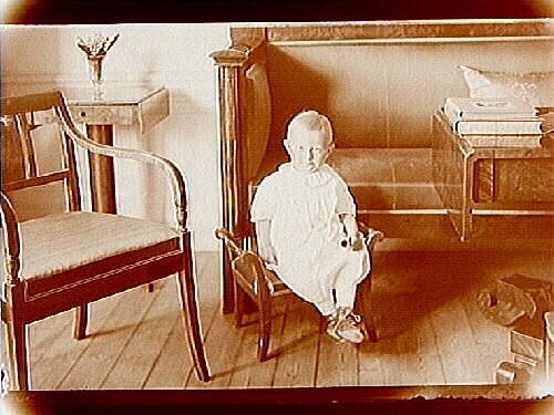 Rumsinteriör, ett barn på pall.