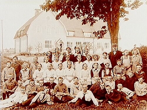 Almby skola, 46 skolbarn med lärare Gustaf Karlsson.