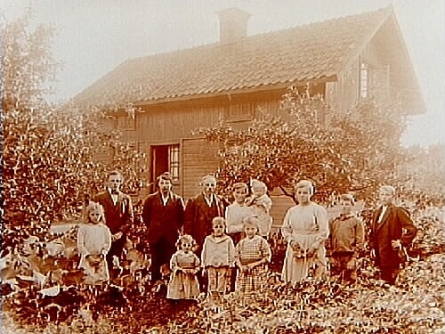 En och en halvvånings bostadshus, 12 personer framför huset.
