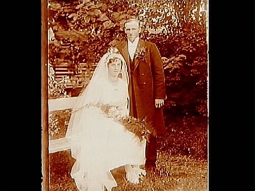 Brudpar, bruden helt i vitt, med myrtenkrona, brudgummen i bonjour.