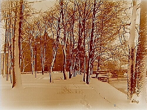 Slottsparken i vinterskrud med slottet och Kanslibron i bakgrunden.