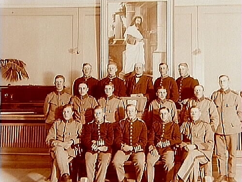 Soldathemmet Grenadjären, interiör, 15 troende beväringar och pastor Öberg.