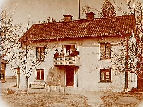 Tvåvånings bostadshus med balkong, 5 personer på balkongen.