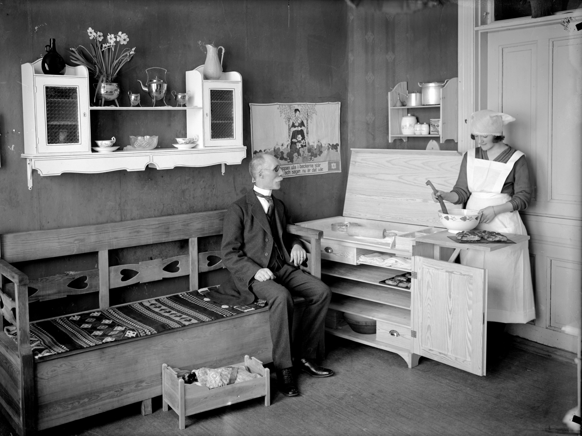 Köksinteriör, en man sitter i soffan och en kvinna bakar.