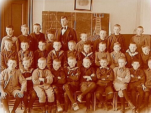 Klassrumsinteriör, 28 skolpojkar med lärare.