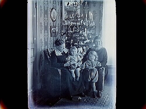 Rumsinteriör, två kvinnor och två småbarn vid julgranen.