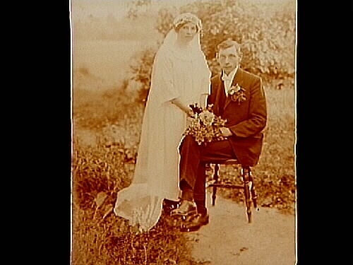 Brudpar, bruden helt i vitt, med lång slöja, brudgummen i mörk kostym.
