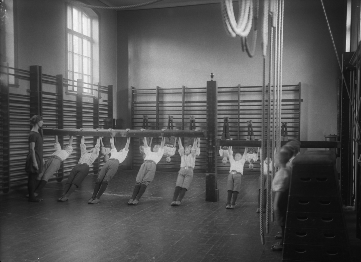 Dövstumskolan, interiör av gymnastiksalen, gossgymnastik.