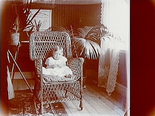 Titel: En liten flicka sitter i en stol. Två bilder (8x8 cm) på samma plåt (8x17 cm).