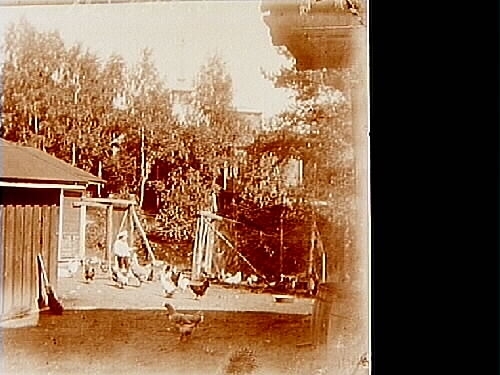 Titel: Hönshus, höns, ett barn. Familjebild. Två bilder (8x8 cm) på samma glasplåt (8x17 cm).