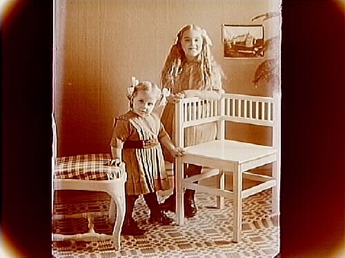 Titel: Familjebild, två flickor, Margit och Märta Lindskog. Rumsinteriör. Sam Lindskog