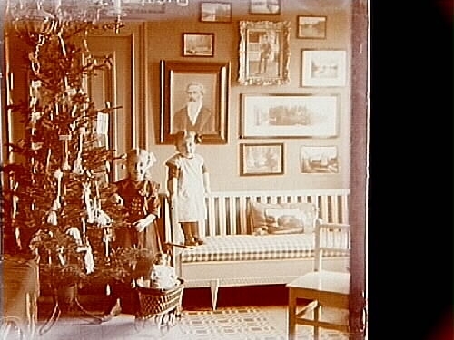 Rumsinteriör, två flickor vid julgranen.