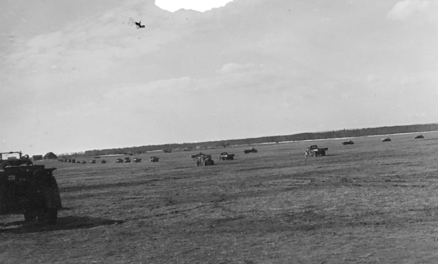F6 Karlsborg 1940. Flygfältet spärrat med kärror och bilar för att förhindra landning av utländska flygplan. Albumet är en del av en donation från Karl-Axel Hansson, Karlsborg. Förteckning över hela donationen finns i albumet, samt som Word-dokument.
