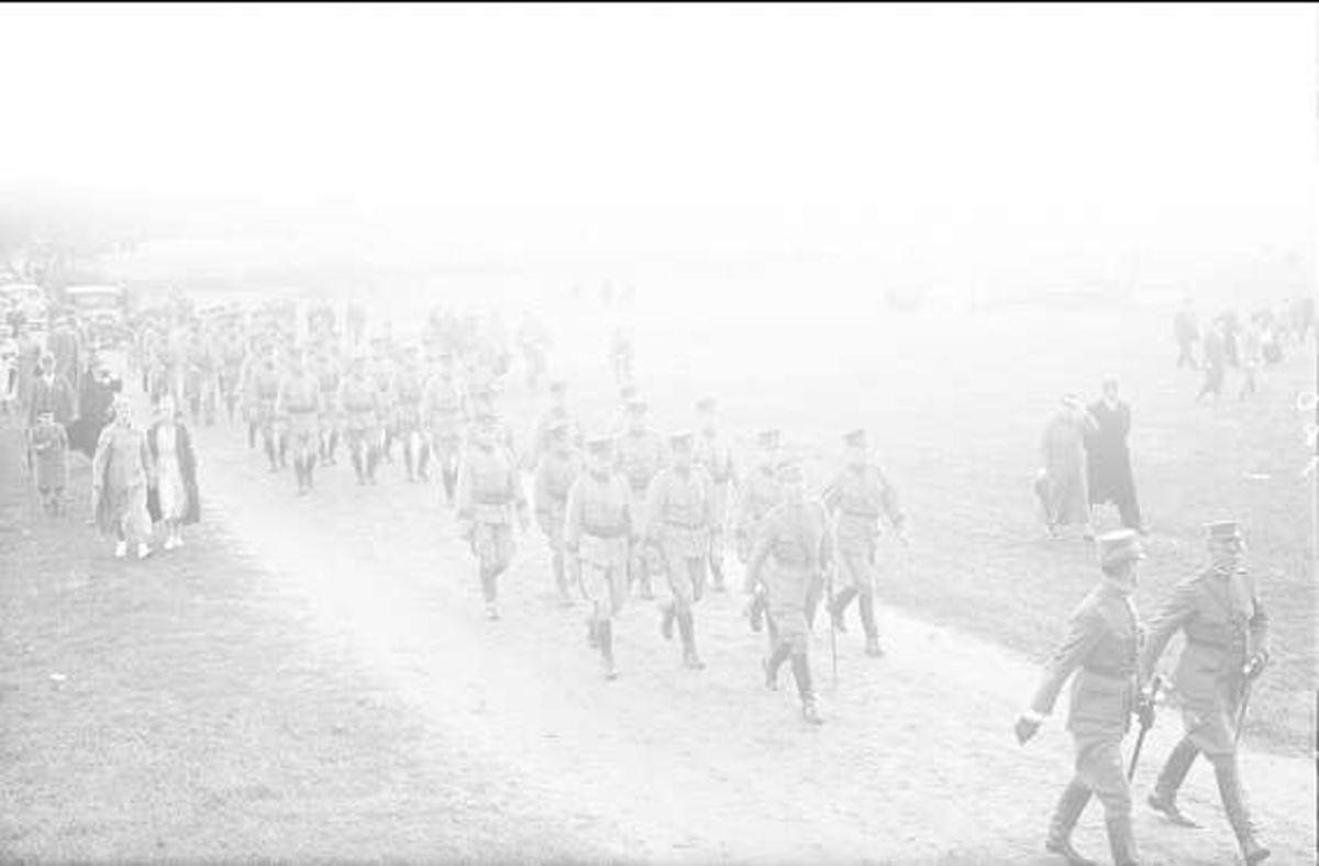 På marsch från kasern till fältgudstjänst i Dunkehall. Närmast kameran skvadronschefen ryttmästare Wilhelm Tham och skvadronsadjutanten fanjunkare Sture Nilsson.